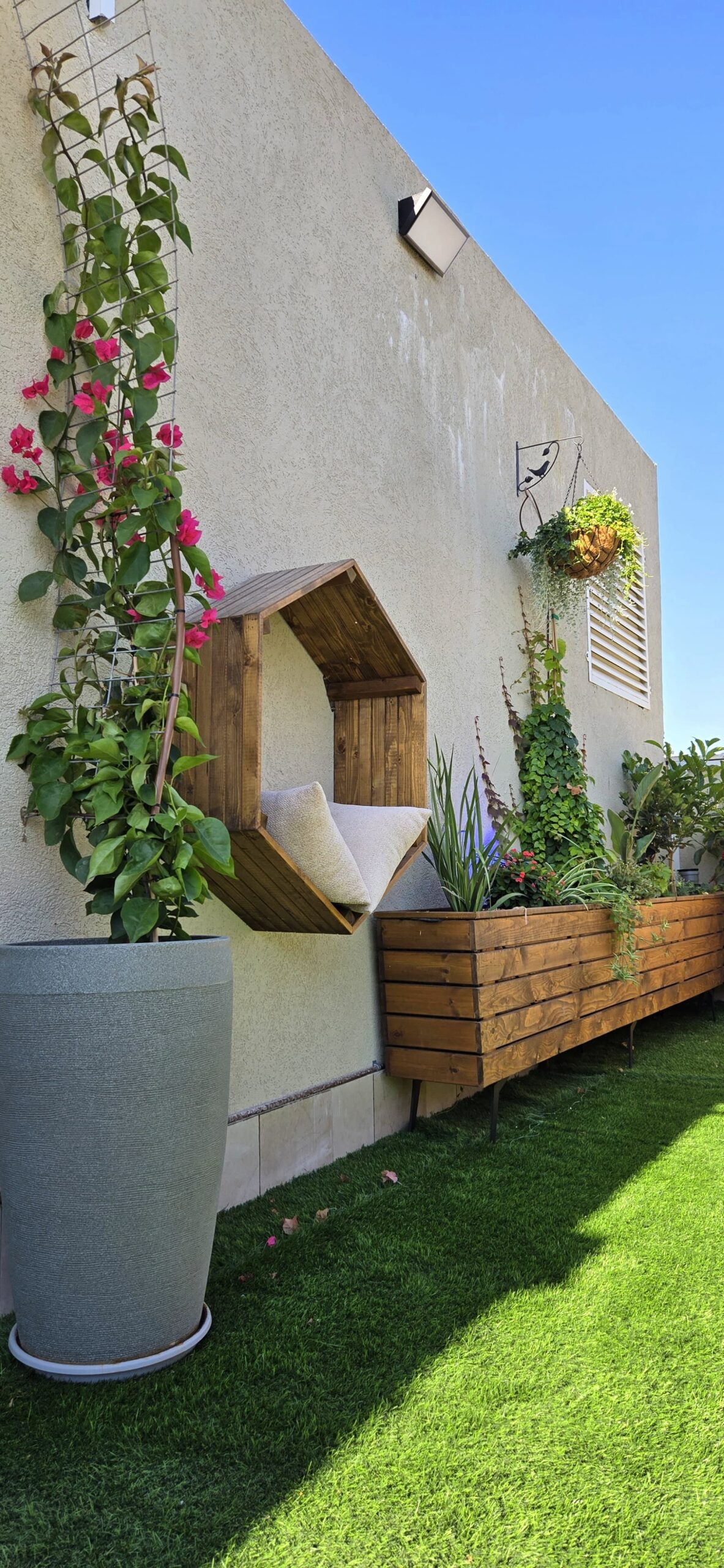 אלמנטים משולבים לגינה: בנייה ויצירה של אדניות עץ, ספסלים ואלמנטים נוספים המשתלבים עם הצמחייה הקיימת.